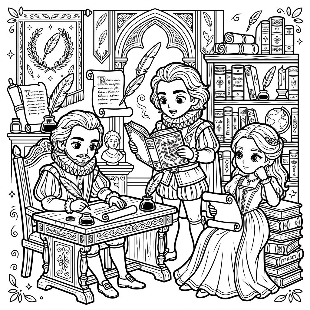 Journey back to the intellectual heart of the Renaissance with this captivating coloring page. This intricate scene brings to life three distinguished literary figures, dressed in period attire, engrossed in their craft. One poet diligently pens verses at a richly detailed desk, quill in hand, surrounded by inkwells and parchment. Another stands absorbed in a classic tome, while a muse-like figure sits gracefully amidst towering stacks of books, a scroll unfurled in her hands. Every element, from their ruffled collars to the ornate furniture, is meticulously designed for an immersive coloring experience.