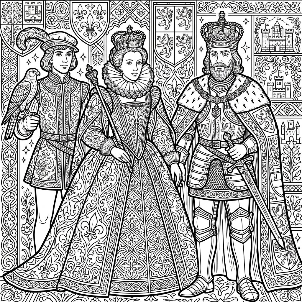 Journey into the opulent world of the Renaissance with this exquisitely detailed adult coloring page. This intricate design showcases three prominent figures: a distinguished king, a majestic queen, and a noble courtier with his falcon. Each character is adorned in lavish period attire, featuring elaborate ruffs, rich fabrics, and stunning crowns, all rendered with meticulous patterns and textures. The king is depicted in armor with a sword, embodying strength, while the queen's gown flows with elegant motifs, and the young courtier's outfit boasts fine embroidery. The depth of detail in their clothing, from the folds of their capes to the jewels on their crowns, invites a truly immersive coloring experience.