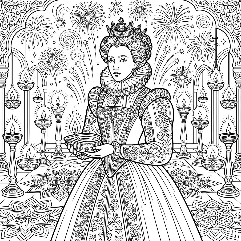 Embark on a captivating coloring journey with this unique page, blending the grandeur of the Renaissance era with the vibrant festivities of Diwali. At the heart of the illustration stands a majestic ruler, elegantly poised and adorned in exquisite period attire, complete with a regal crown and an elaborate ruffled collar. Every detail, from the intricate patterns on her gown to the delicate features of her expression, invites you to bring this historical figure to life with your chosen palette.
