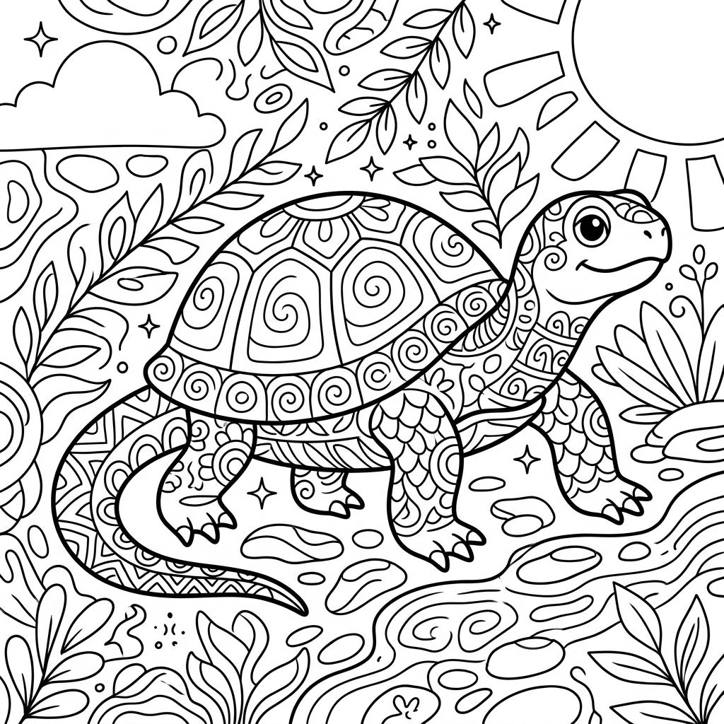 Embark on a creative journey with this enchanting Zentangle Turtle coloring page, perfect for young adventurers! This friendly reptile features a shell and body adorned with a delightful array of intricate Zentangle patterns, from swirling spirals to delicate scales. The whimsical background complements the turtle with leafy vines, a smiling sun, and fluffy clouds, all filled with unique designs waiting for your artistic touch.