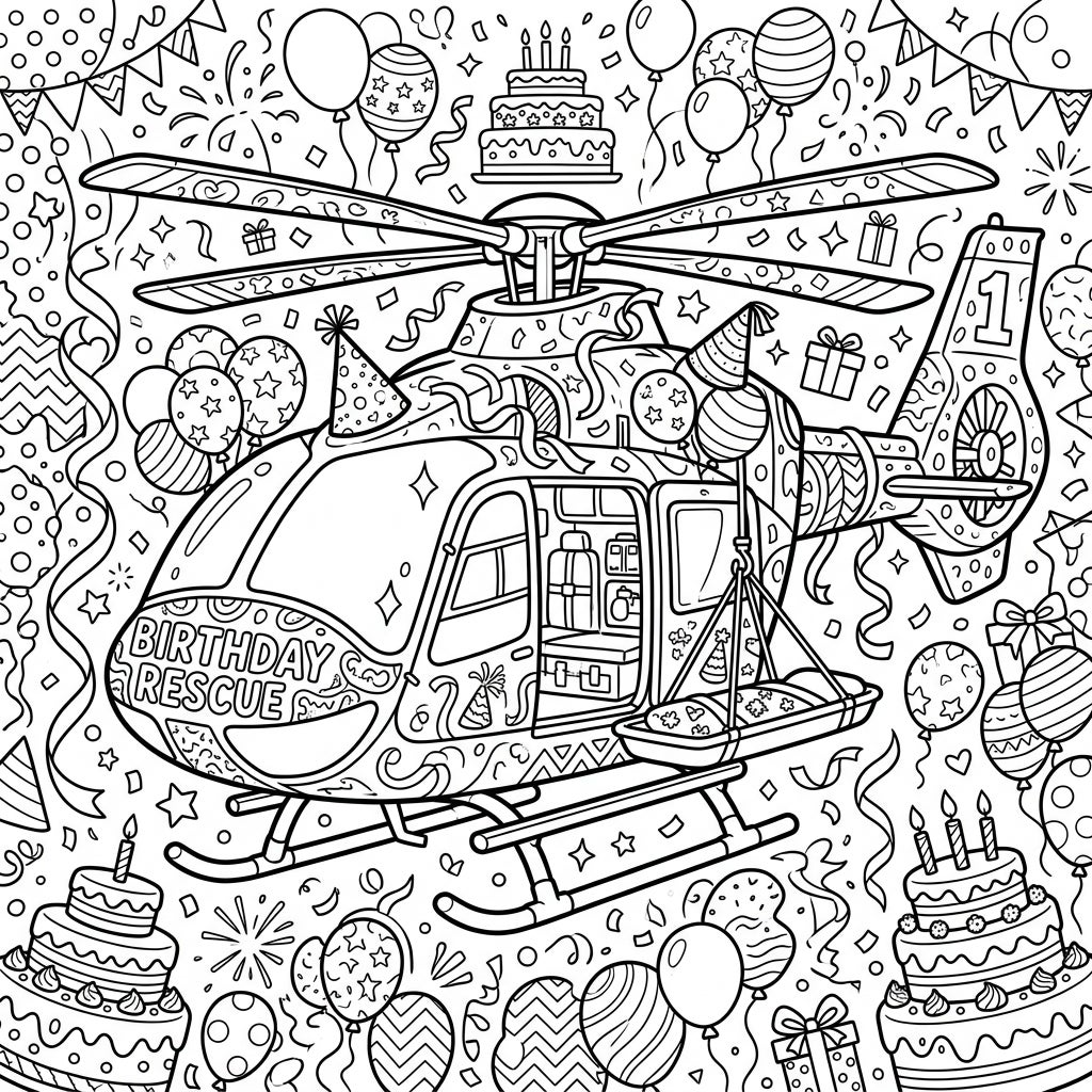 The air is thick with celebration as this heroic helicopter takes center stage amidst a flurry of birthday cheer. The background is a vibrant tapestry of party essentials: towering tiered cakes, playful balloons, scattered presents, and an abundance of confetti and streamers. Every corner of this page bursts with the excitement of a birthday bash, inviting you to immerse yourself in a world where daring rescues meet delightful festivities.