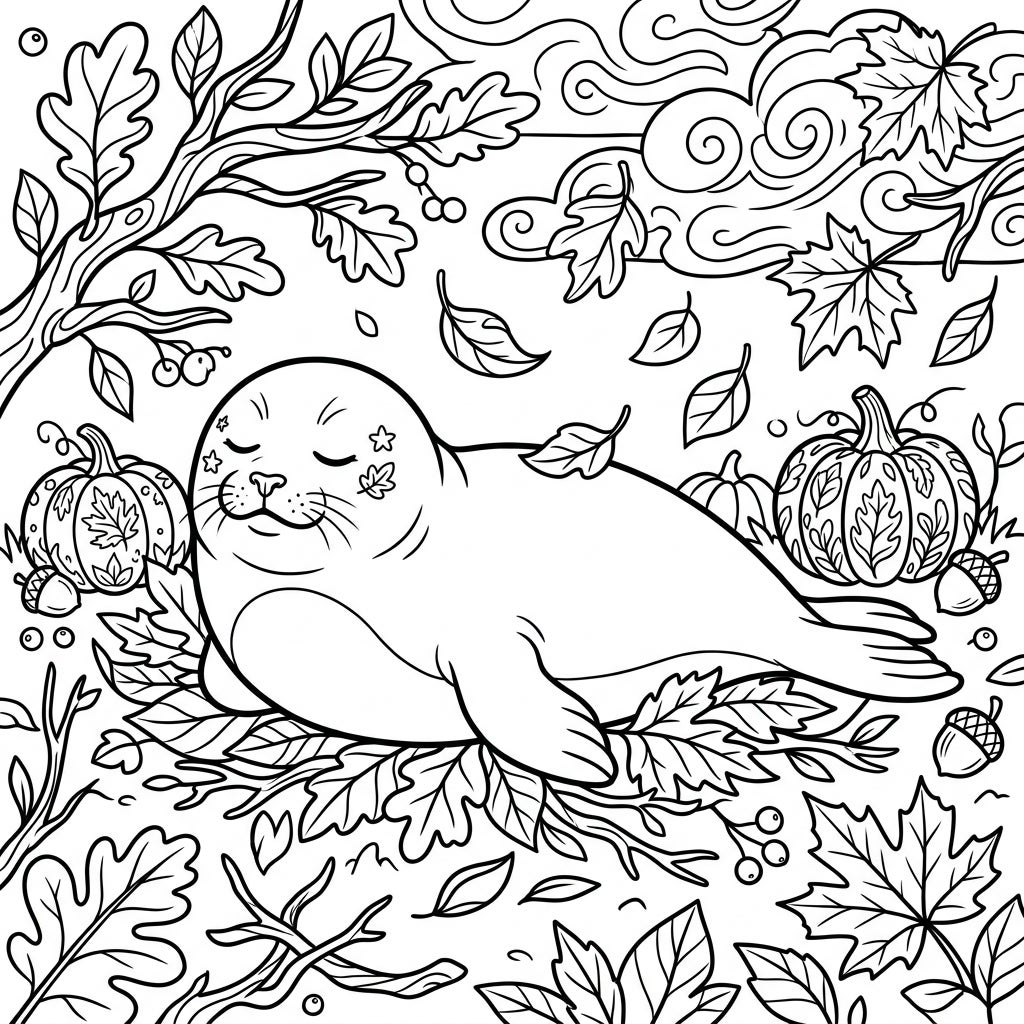 Unwind with this adorable coloring page featuring a tranquil seal enjoying a nap amidst the beauty of autumn. Delicate fall foliage, charming pumpkins, and a serene atmosphere await your creative touch.