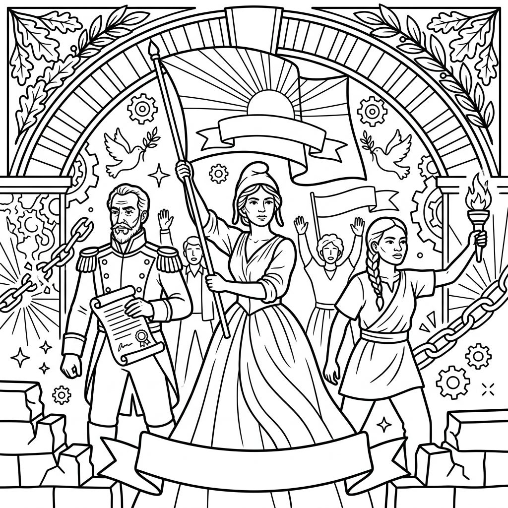 Dive into a vivid historical tableau with this intricately designed coloring page, showcasing a powerful assembly of revolutionary leaders. At the forefront, a distinguished general holds a vital document, symbolizing the principles of freedom and justice. Beside him, a majestic female figure, reminiscent of Liberty or Marianne, proudly raises a flag, embodying the spirit of uprising. Behind them, a determined torchbearer illuminates the path forward, joined by other impassioned individuals raising their hands in solidarity, all striving towards a brighter future.