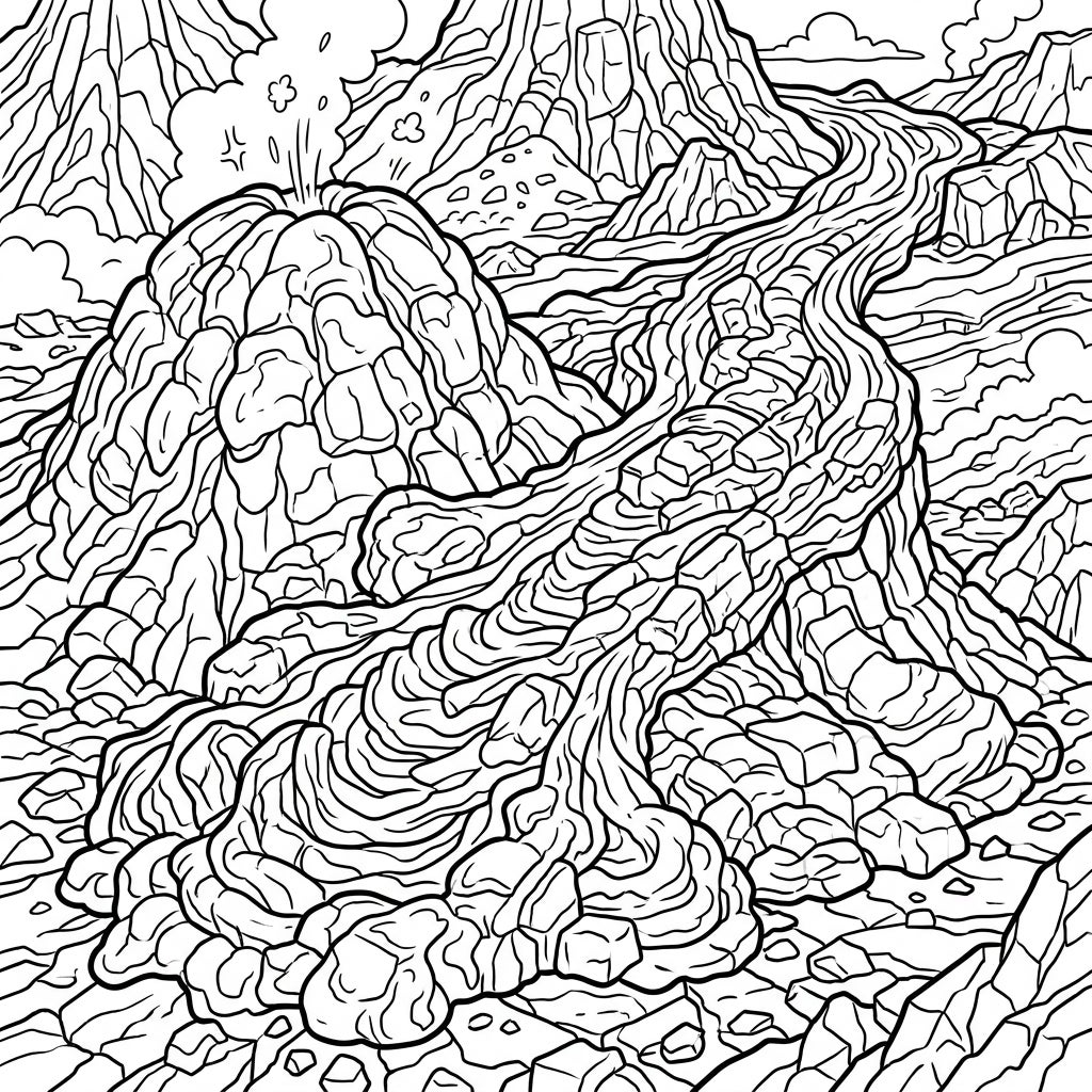 This captivating coloring page plunges you into a dramatic volcanic scene, showcasing highly viscous rhyolitic lava flows in stunning detail. Observe the intricate domes and thick, blocky structures of the cooling lava, meticulously rendered with refined line work. The entire composition is densely filled with geological textures and unique cooling patterns, ensuring there's no dull corner to color, from the erupting vent to the sprawling rocky landscape.