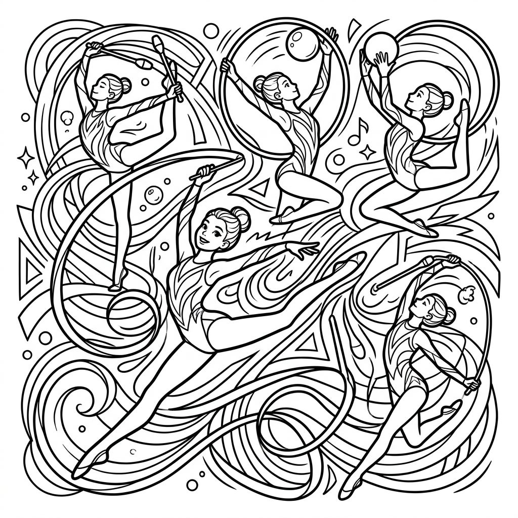 Step into the dazzling world of rhythmic gymnastics with this intricate coloring page! Observe a stunning array of gymnasts, each frozen in a moment of athletic artistry. From the flowing ribbons that dance through the air to the perfectly balanced hoops and balls, every detail invites your artistic touch. Notice the delicate balance and powerful flexibility as these athletes perform their mesmerizing routines, surrounded by a captivating backdrop of swirling lines and abstract shapes designed to enhance the sense of movement and excitement.