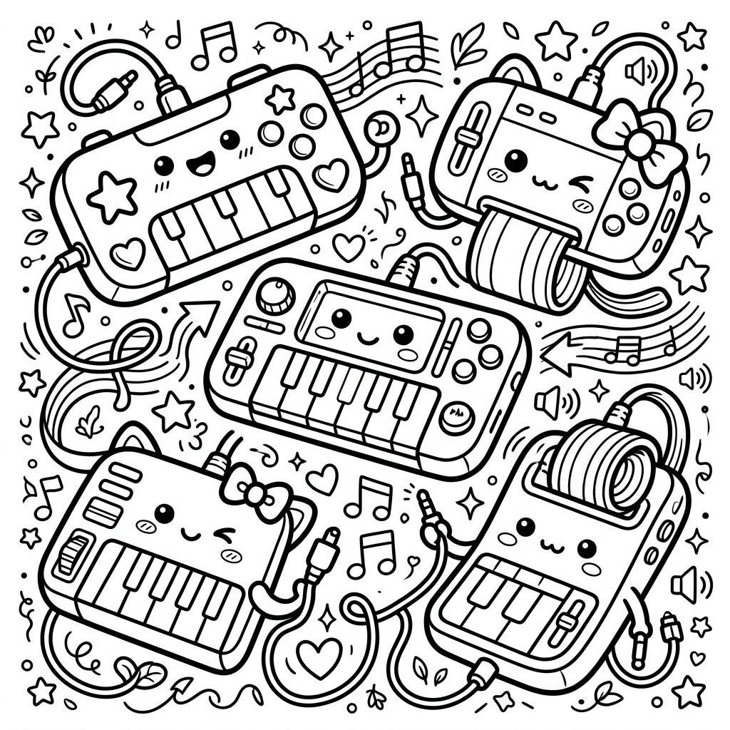Unleash your creativity with this super cute Kawaii coloring page featuring adorable ribbon controllers and mini keyboards. Perfect for music lovers and Kawaii fans of all ages looking for a fun and engaging art activity.