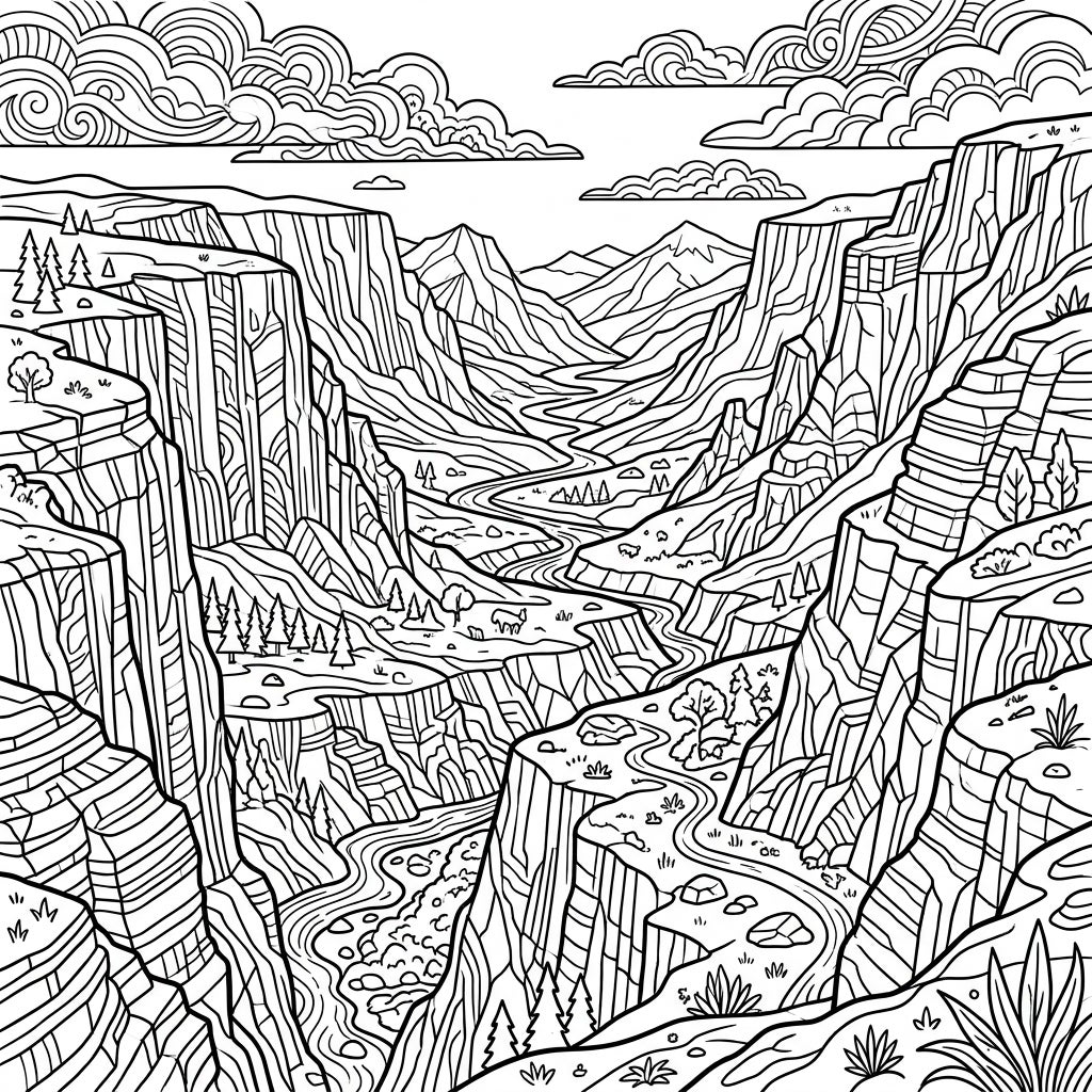 Embark on an artistic journey into the heart of a majestic rift valley with this complex coloring page. Designed specifically with teens in mind, this intricate illustration showcases towering, textured cliff faces that plunge dramatically into a winding riverbed below. Observe the fine details of geological layers, distant mountain peaks, and a dynamic sky filled with swirling clouds, all awaiting your creative touch.