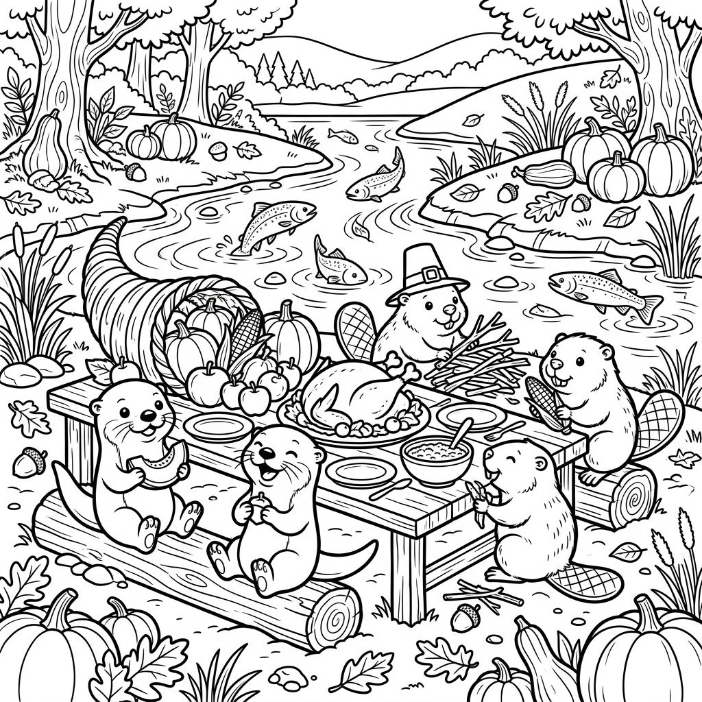 Dive into the festive spirit with this delightful Thanksgiving coloring page featuring playful river animals. Watch as otters and beavers gather for a bountiful feast, perfect for celebrating the harvest season.