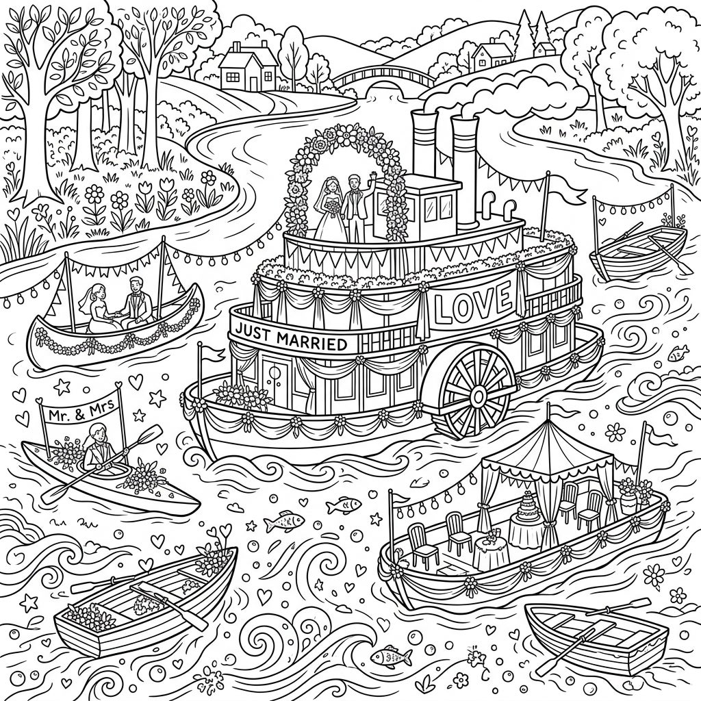 Set sail for a romantic adventure with this delightful wedding river boats coloring page, perfect for celebrating love on the water. Discover various beautifully adorned watercraft, from elegant steamboats to charming canoes, all dressed up for a special day.