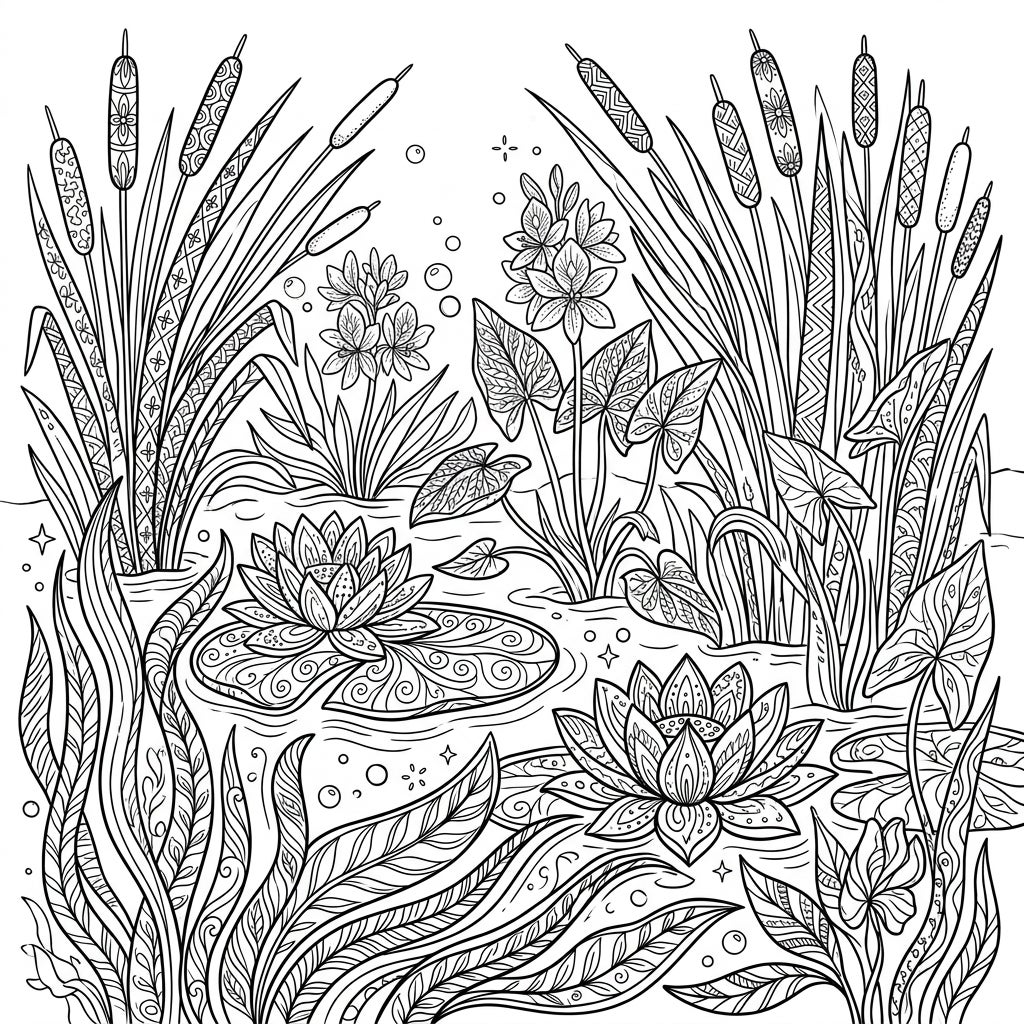 Immerse yourself in the lush tranquility of an aquatic ecosystem with this captivating Zentangle River Plants coloring page. This densely packed design showcases a vibrant array of freshwater flora, including elegant water lilies resting on their iconic pads, towering cattails adorned with unique patterns, and various other riparian vegetation. Each element, from the delicate petals of the water lilies to the swaying blades of grass, is meticulously rendered with intricate Zentangle artistry, transforming natural forms into a rich tapestry of abstract designs.