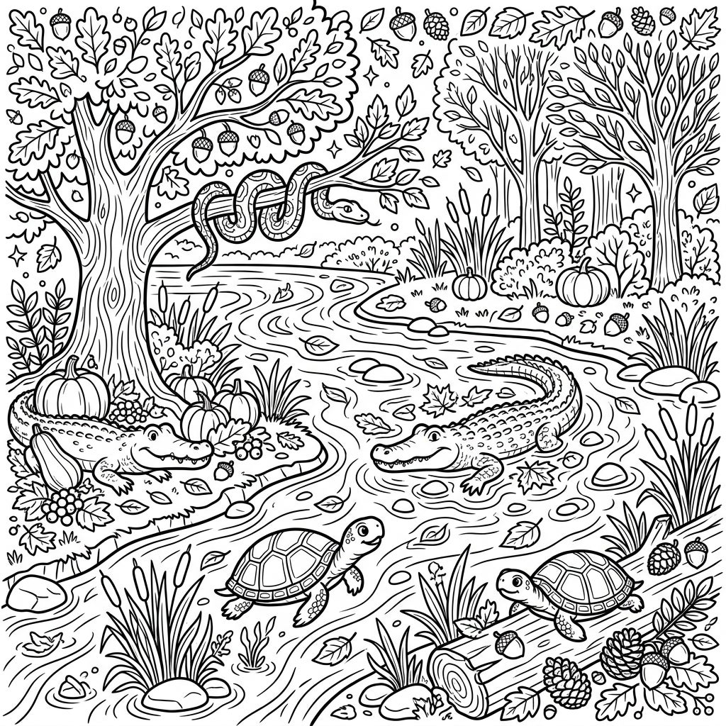 This unique coloring experience perfectly blends the cool charm of river creatures with the warm, inviting spirit of the autumn season. Imagine the crisp air, the earthy scents, and the joy of harvest as you color each element. From the intricate scales of the reptiles to the texture of the tree bark and the delicate veins of the leaves, every detail is designed to spark creativity and provide a relaxing artistic escape. It's an opportunity to celebrate nature's cycles and the fascinating inhabitants of our waterways during this special time of year.