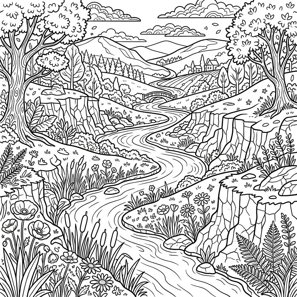 This captivating coloring page invites you to explore a stunning river valley landscape. A graceful river meanders through the heart of the scene, flanked by towering trees with lush foliage and rugged rock formations. Observe the charming variety of wildflowers, ferns, and cattails that adorn the riverbanks, creating a rich tapestry of natural beauty.