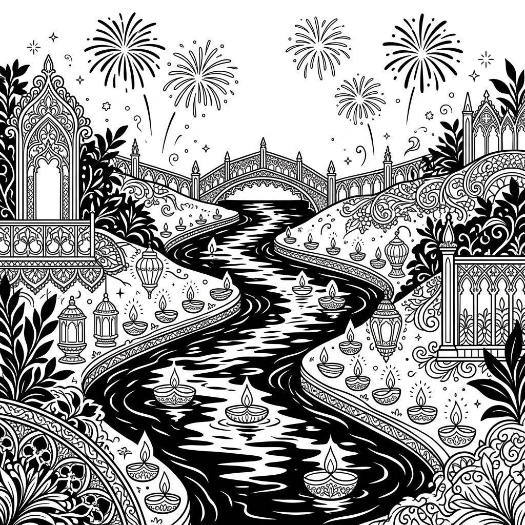 Unveil a scene of profound beauty and mystery with this captivating coloring page, where a sinuous river gracefully winds through an intricately detailed landscape. The dark waters are aglow with countless floating diyas, casting their symbolic light along the ornate banks which boast striking Gothic architectural elements, delicate Victorian-inspired lace patterns, and traditional Indian motifs. In the distance, a grand, arched bridge adds to the majestic scenery, while festive fireworks burst across the night sky, creating a breathtaking tableau of celebration and serenity.