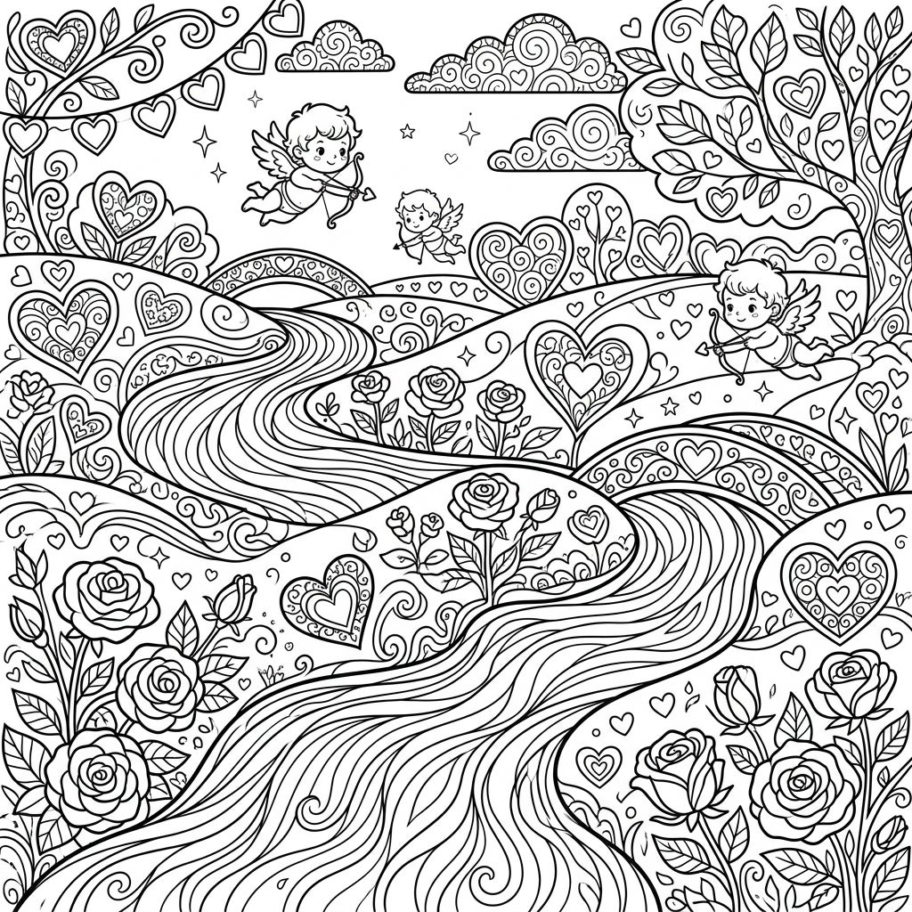 Celebrate love with this beautiful Valentine's Day coloring page, featuring a serene river winding through a landscape filled with hearts, roses, and playful cupids. It's the perfect artistic escape to bring romantic hues to life.