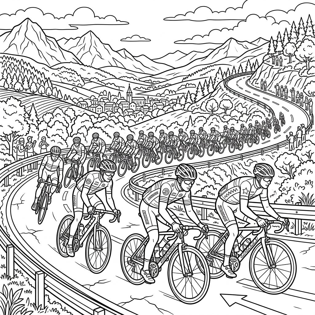 This full-scene illustration perfectly captures the spirit of endurance and competition found in a professional cycling event. Feel the rush of the wind and the focus of the athletes as they navigate challenging terrain. It's a celebration of human spirit, teamwork, and the beauty of outdoor sports, offering a rich narrative for your coloring creativity.