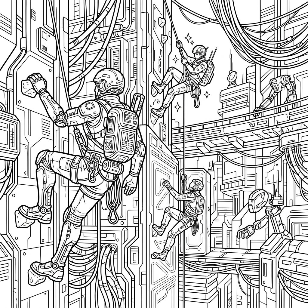 Dive into an action-packed world where rock climbers ascend the dizzying heights of a cyberpunk metropolis. This unique coloring page combines human resilience with futuristic technology, perfect for an engaging artistic challenge.