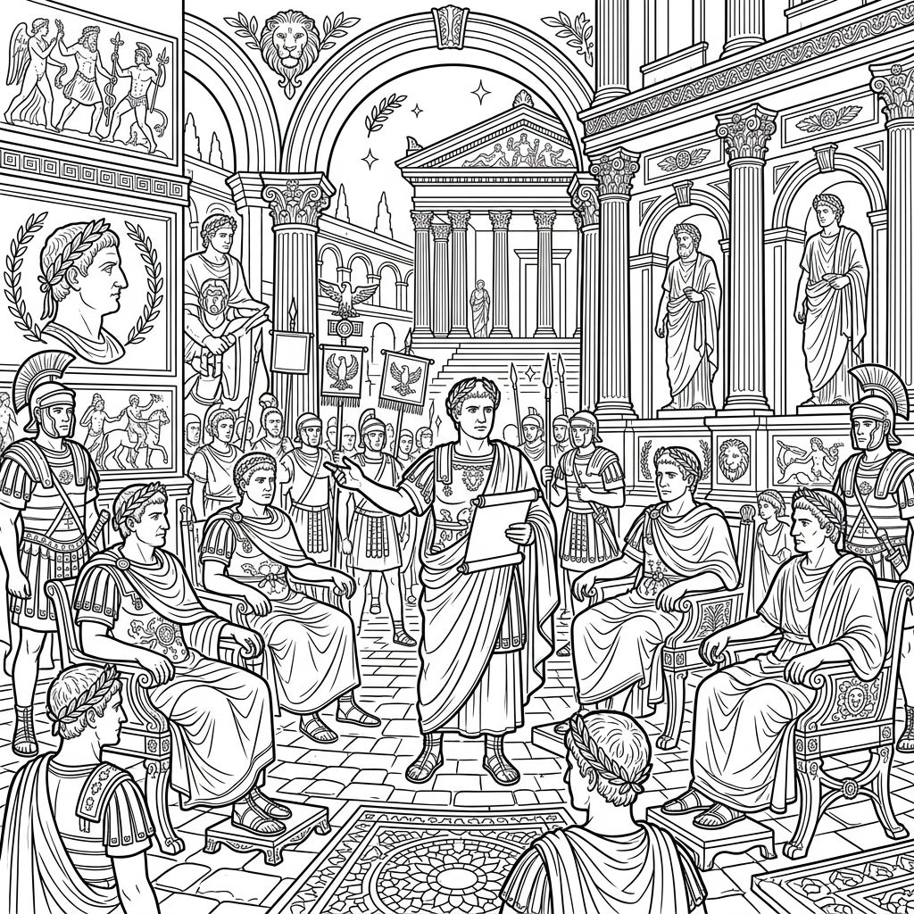Step into the heart of the Roman Empire with this captivating full scene coloring page, meticulously designed to transport you to an era of power and majesty. This intricate illustration features a commanding Roman Emperor, perhaps an orator or a leader addressing his court, surrounded by seated senators or dignitaries. Beyond this central tableau, a bustling scene unfolds with Roman soldiers in their distinctive armor, adding to the atmosphere of imperial authority, all set against a backdrop of magnificent classical architecture with grand columns, arches, and decorative elements.