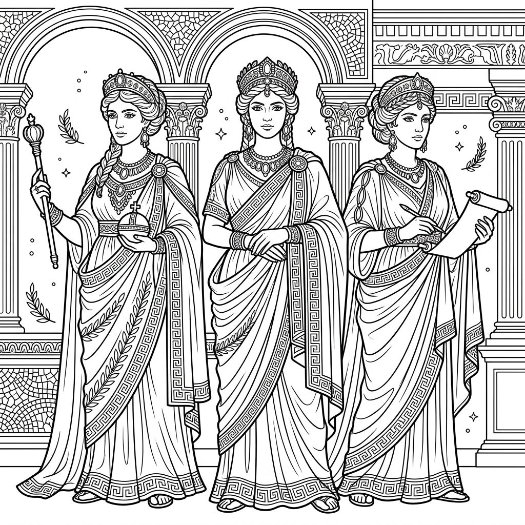 This exquisite coloring page transports you directly to the heart of Ancient Rome, presenting three dignified Roman Empresses in full imperial regalia. Each figure is meticulously detailed, from the intricate patterns adorning their flowing robes and sashes to the delicate designs of their crowns and opulent jewelry. The background provides a rich tapestry of classical Roman architecture, complete with grand arches, stately columns, and ornate mosaic patterns, all waiting for your artistic touch.