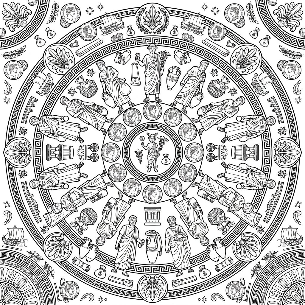 Delve into the fascinating world of ancient Roman commerce with this exceptionally intricate mandala coloring page. The design features a captivating array of Roman merchants, each adorned in historical tunics and robes, diligently carrying their wares – from overflowing baskets of goods and classic amphorae to scrolls and sacks of coins. Radiating outwards from a central figure, possibly Mercury, the patron god of commerce, holding his caduceus, the mandala is rich with authentic Roman details. Discover ancient coins bearing the profiles of emperors, delicate laurel wreaths, classic Greek key patterns, and even miniature merchant ships, all contributing to a rich tapestry of historical artistry.