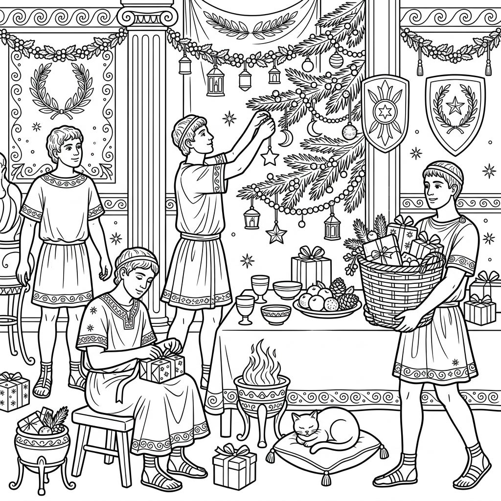 Unleash your artistic flair and explore a palette that bridges two distinct worlds. Consider vibrant reds and greens for the Christmas decorations, contrasting with earthy browns, deep blues, and subtle golds for the Roman attire and architectural elements. Pay close attention to the intricate patterns on the tunics, the delicate designs of the ornaments, and the textures of the food and the cozy cat. Whether you choose historically accurate shades or let your imagination run wild, this Roman Christmas scene offers endless opportunities for shading, blending, and making it uniquely yours.