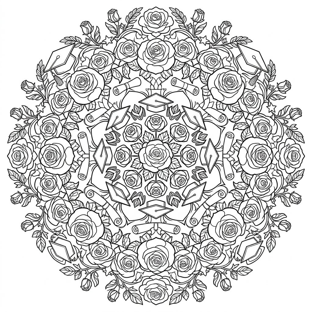 Mark a special academic achievement with this elegant Rose Mandala Graduation coloring page. It beautifully blends intricate rose patterns with classic graduation symbols for a meaningful and relaxing creative escape.