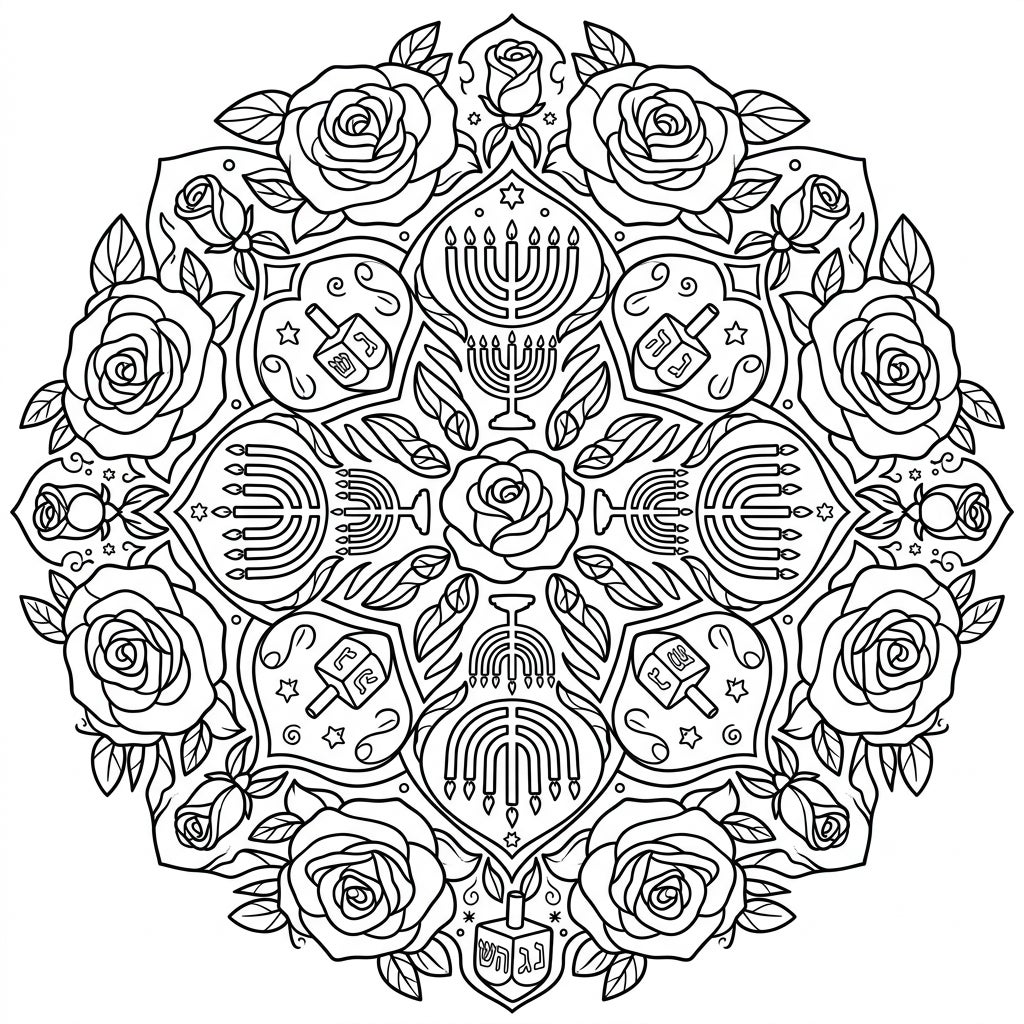 Discover a unique blend of nature and tradition with this captivating Rose Hanukkah Mandala coloring page. Its intricate design features beautiful roses alongside festive menorahs and dreidels, offering a delightful coloring experience for all ages.