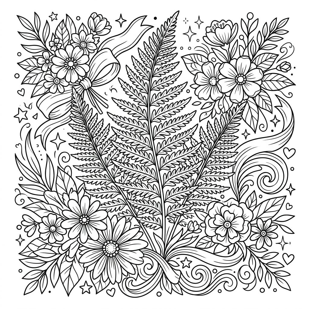 At the heart of this exquisite coloring page lies a majestic royal fern, its bold, upright fronds unfurling with intricate detail. Surrounding this natural centerpiece is a lush tapestry of delicate floral bouquets, featuring various blossoms and verdant leaves. Ribbons gracefully intertwine with the foliage, while charming symbols like tiny hearts and sparkling stars add a touch of whimsy, creating a full-page design rich with opportunities for creative expression.