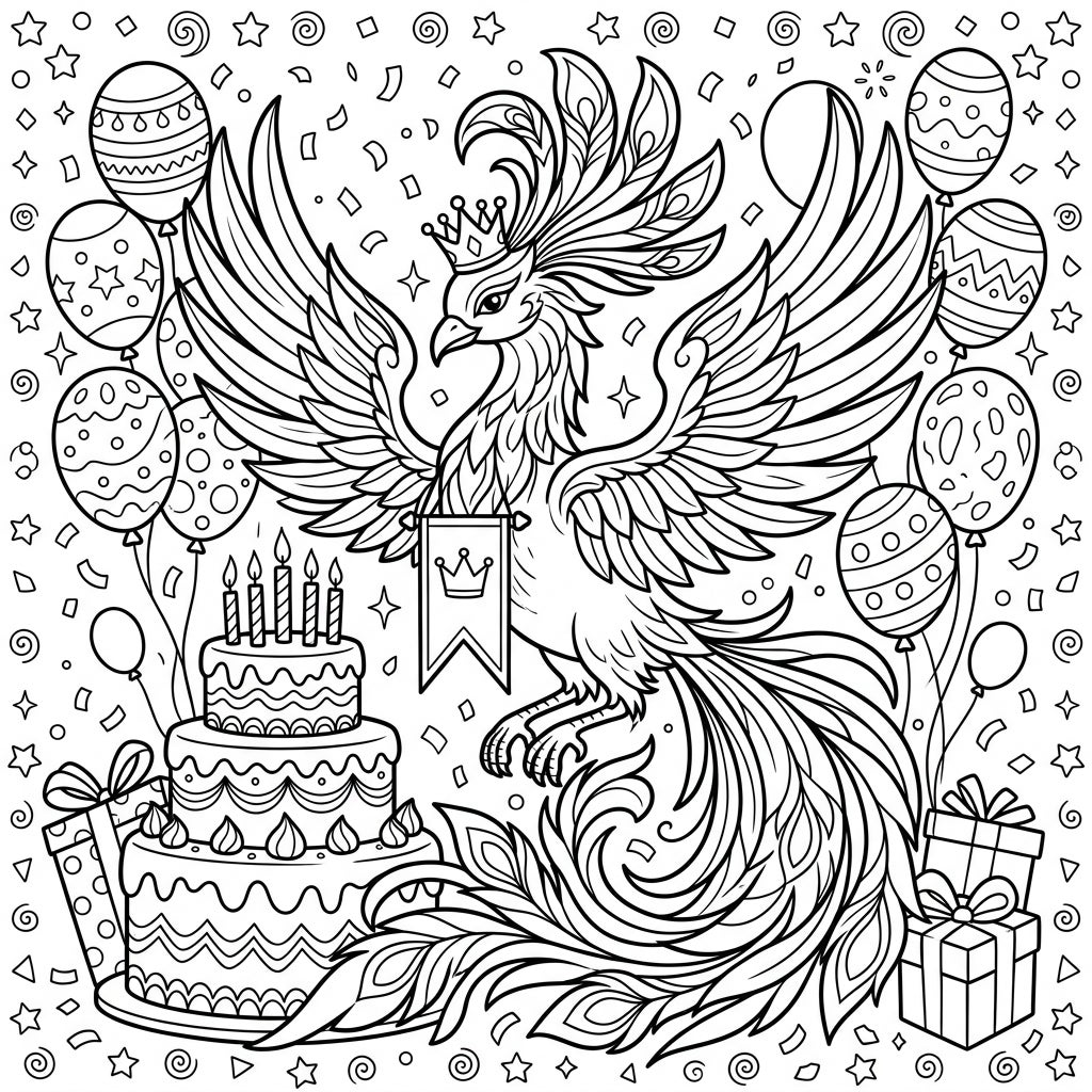 Prepare to immerse yourself in a vibrant celebration as a magnificent Royal Phoenix takes center stage on this captivating coloring page. Adorned with a grand crown and holding a banner, this mythical bird is the epitome of regal splendor. Surrounding this majestic creature are all the hallmarks of an unforgettable birthday bash: a beautifully tiered cake with glowing candles, an abundance of intricately patterned balloons, and carefully wrapped gift boxes waiting to be opened. The air is filled with falling confetti and sparkling stars, inviting you to bring this festive scene to life.