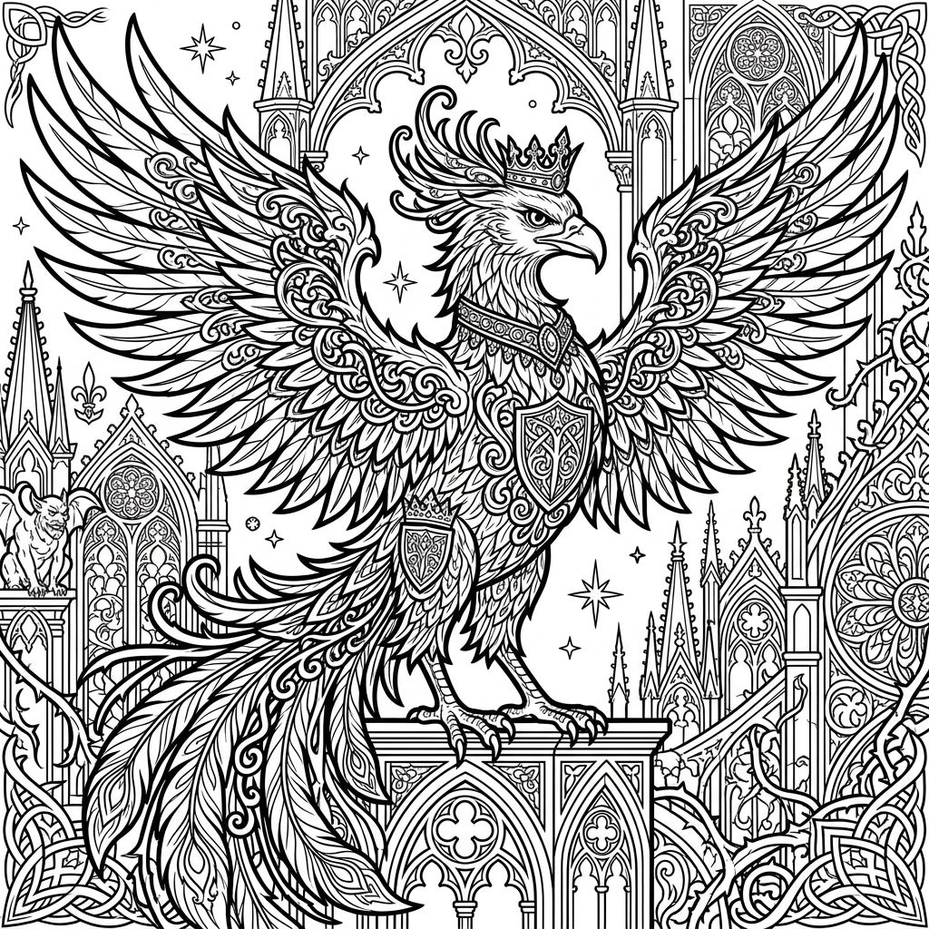 Bring this magnificent creature to life with your personal palette. Consider using deep jewel tones like amethyst purple, emerald green, and ruby red for the phoenix itself, perhaps contrasted with metallic golds or silvers for its crown and emblems. For the intricate gothic architecture, explore shades of charcoal, slate gray, and deep blues to enhance the mysterious atmosphere, adding subtle highlights to define the elaborate carvings. Experiment with shading and blending techniques to give depth to the feathers and stone, transforming this line art into a vibrant, expressive work of art.