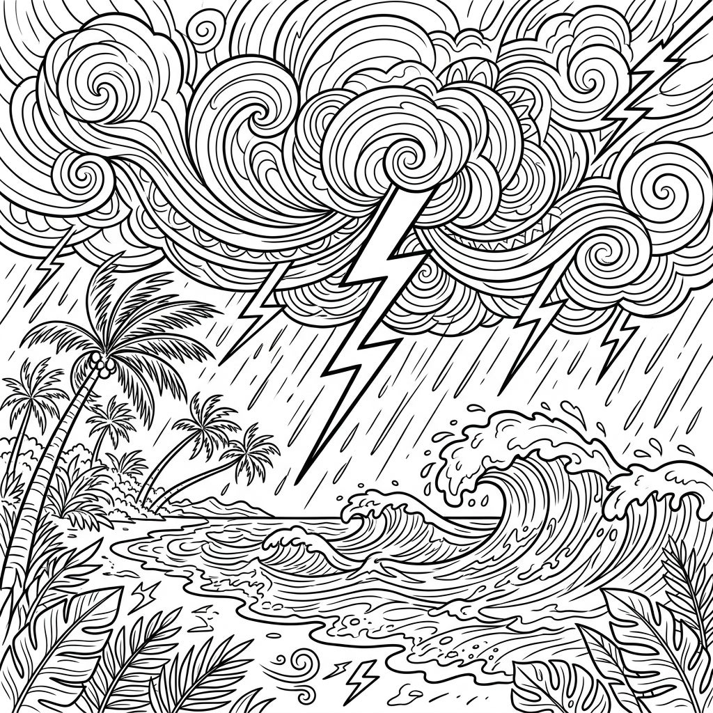 Designed for adult and teen colorists, this linear art illustration offers an engaging challenge with its thick, clean outlines and detailed patterns. Consider using deep blues and grays for the stormy sky, vibrant greens for the tropical plants, and foamy whites for the crashing waves to bring this scene to life. Experiment with shading and texture to emphasize the movement of the clouds, the shimmer of the rain, and the roar of the ocean, turning this powerful storm into your personalized masterpiece.