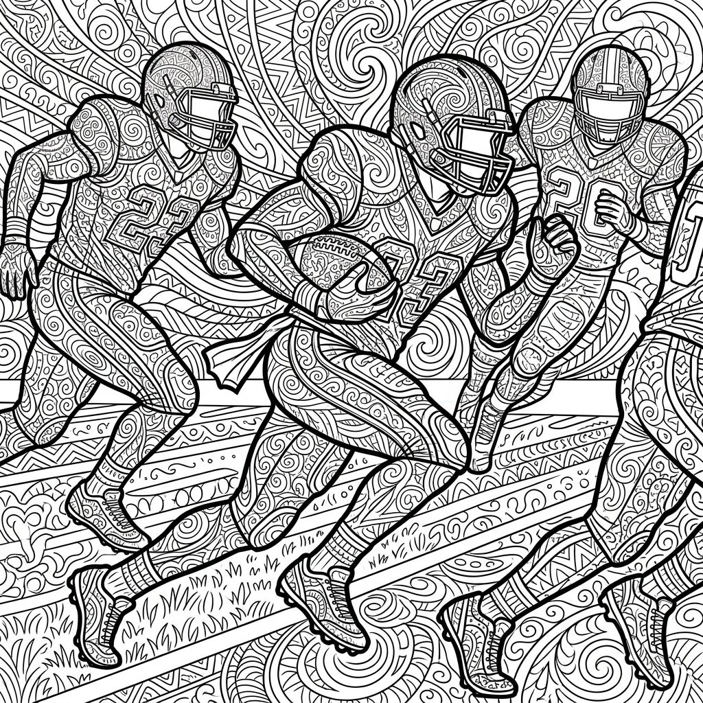 Experience the thrill of football and the serenity of Zentangle art with this captivating coloring page. Dynamic running backs, adorned with intricate patterns, are poised for action, offering a unique and engaging creative outlet.