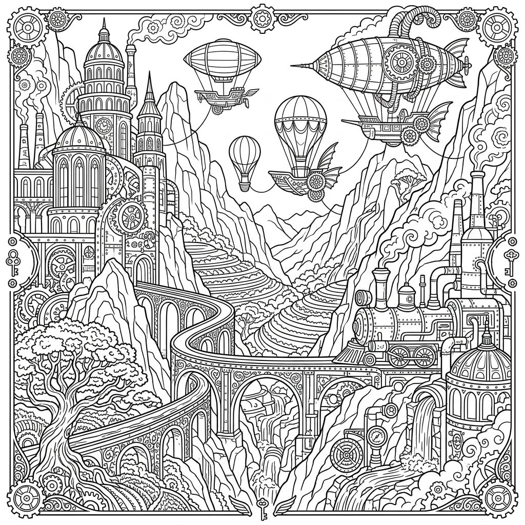 Dive into a breathtaking world where ancient valleys meet futuristic machinery in this stunning Steampunk coloring page. Discover intricate details of majestic landscapes, towering industrial structures, and fantastical airships waiting for your artistic touch.