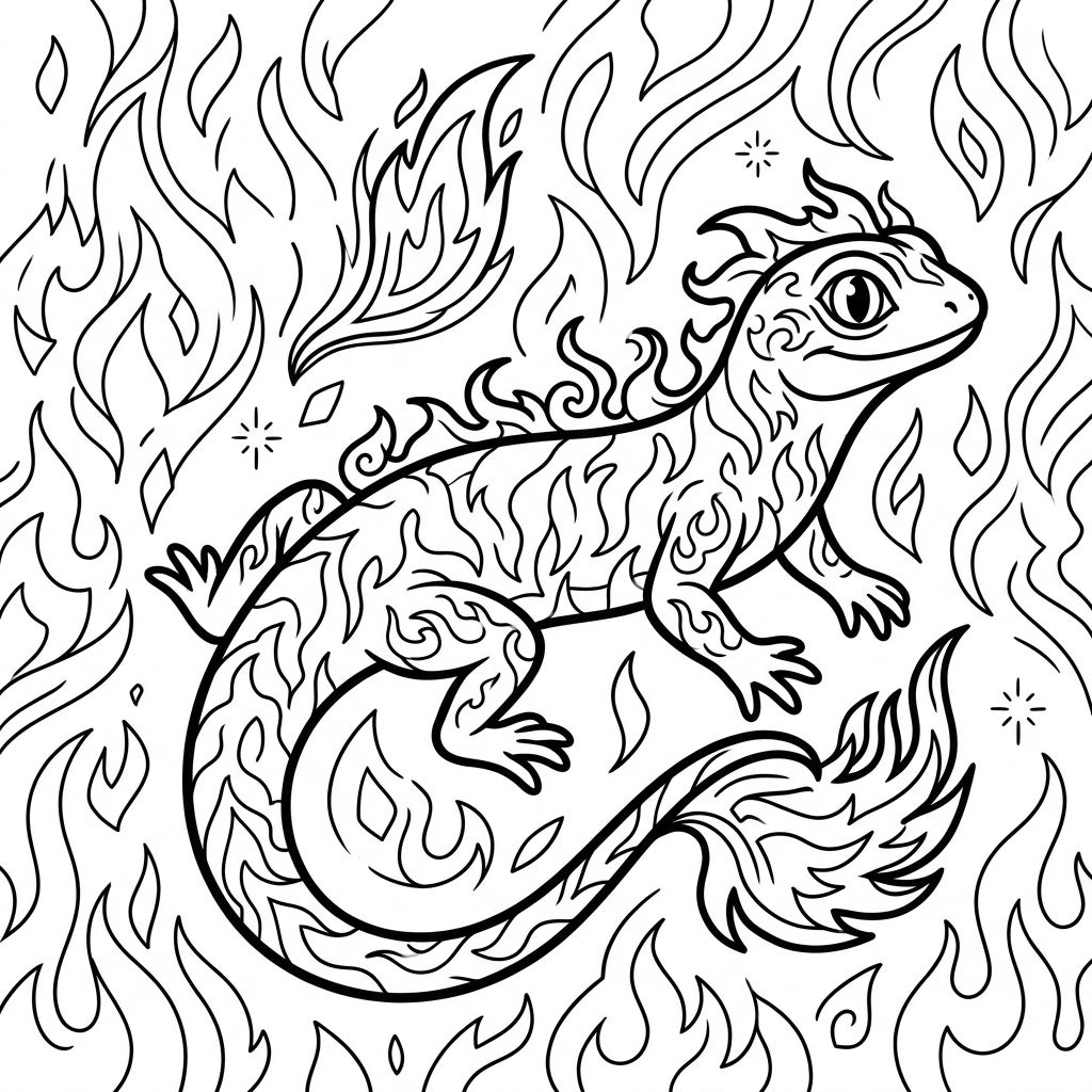 Embark on an artistic adventure with this captivating coloring page featuring a mythical salamander. This legendary creature, often associated with fire and rebirth, is presented in a dynamic pose, its body adorned with swirling, flame-like patterns that suggest its fiery essence. The intricate details on its skin, head, and tail offer a delightful challenge for colorists, inviting a variety of creative interpretations.
