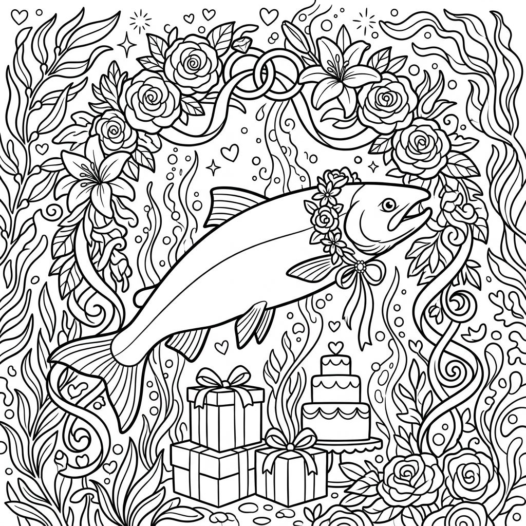 Embark on an aquatic adventure with this charming salmon wedding coloring page. It features a festive fish adorned with flowers, surrounded by wedding symbols, ready for your creative touch.