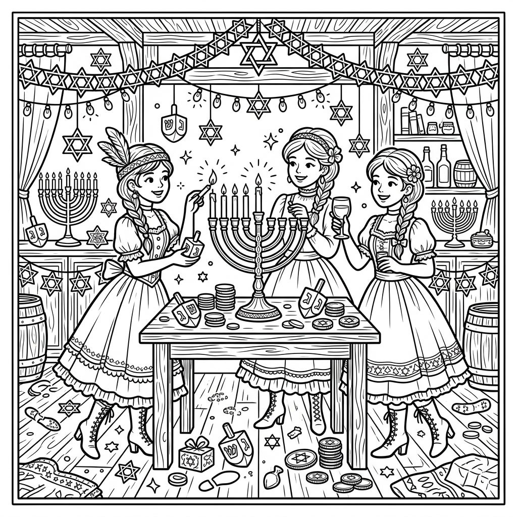 Discover a delightfully unexpected scene where Wild West saloon girls gather to celebrate Hanukkah. This unique coloring page combines festive holiday traditions with a charming historical setting, promising a truly imaginative coloring experience.