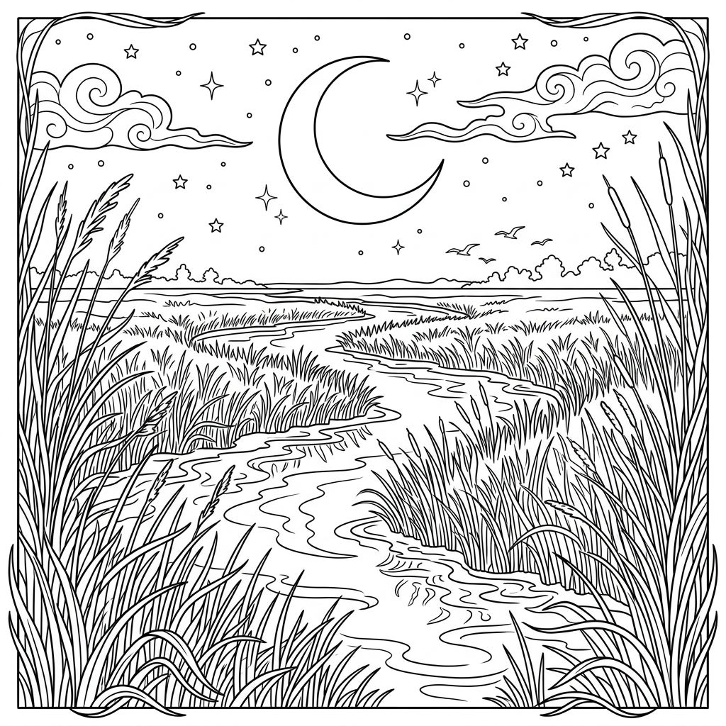 Immerse yourself in the tranquil beauty of a moonlit salt marsh with this detailed coloring page. Bring to life the swaying reeds and winding waters under a star-studded night sky.
