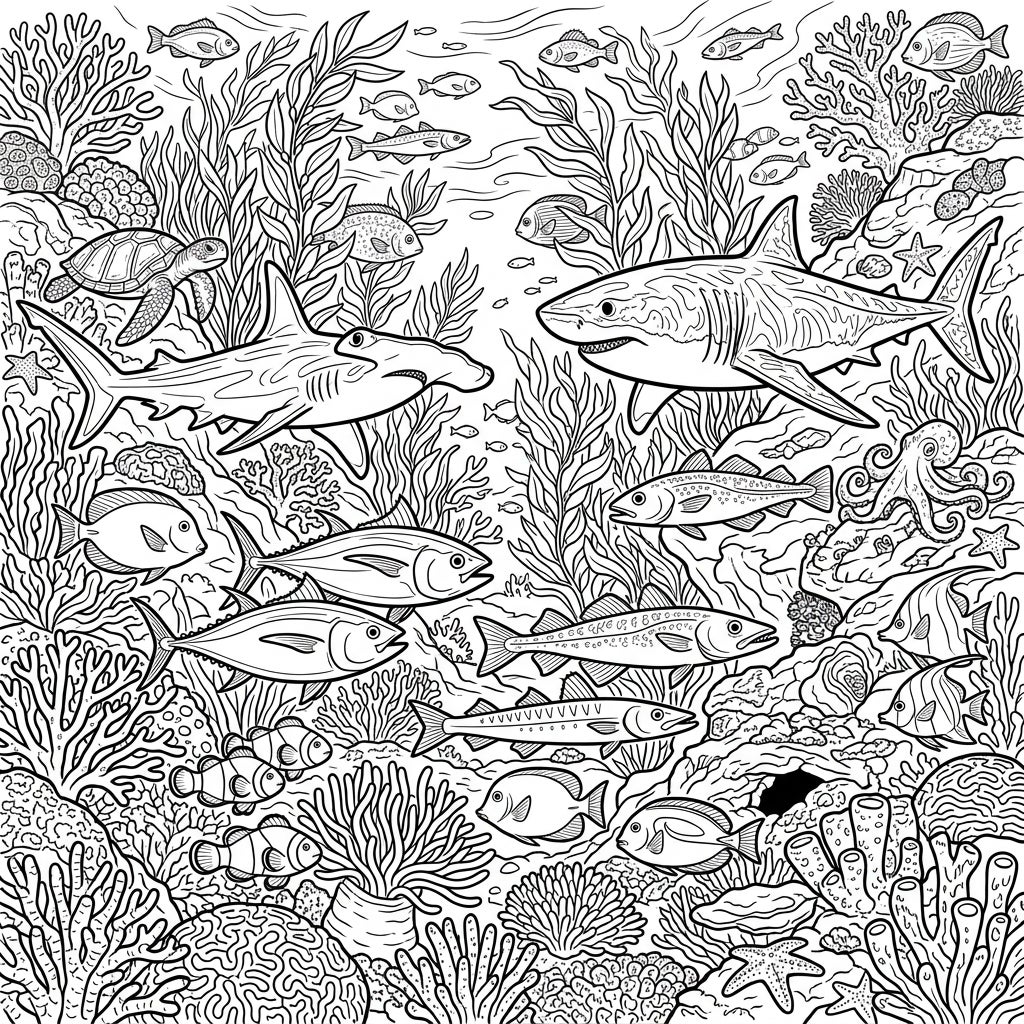 Plunge into the bustling depths of the ocean with this incredibly detailed full-scene coloring template, teeming with life. This intricate design brings together an impressive array of saltwater fish, including the formidable great white shark and the unique hammerhead shark, alongside sleek tuna and charming clownfish. A graceful sea turtle glides through the dense aquatic foliage, while an octopus peeks from among the rocky corals, all set within a rich tapestry of swaying seaweed, intricate coral formations, and scattered starfish.