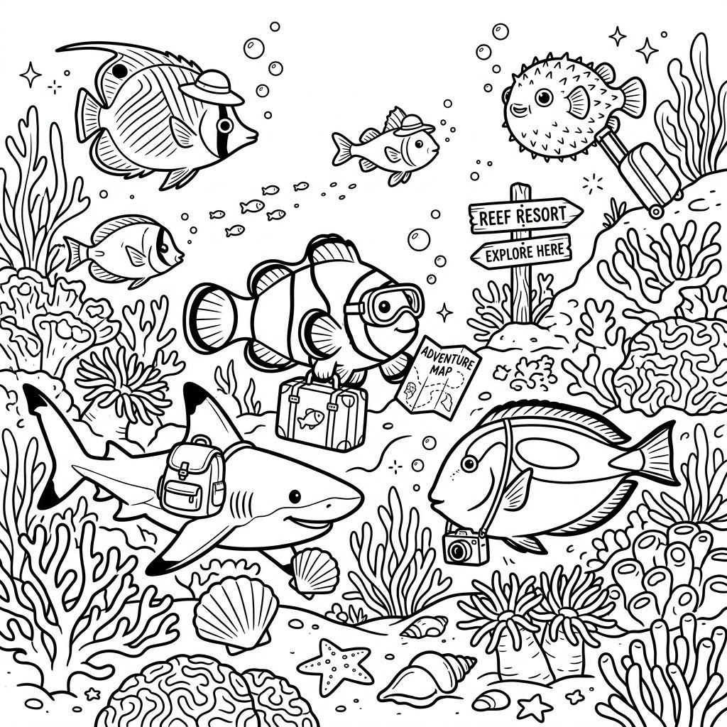 Bring this vibrant marine world to life with your favorite colors! Experiment with a spectrum of hues for the diverse fish species, from the vivid oranges of a clownfish to the shimmering blues of a tang. Don't forget the intricate coral formations – use various shades of pink, red, and purple to make them pop. Add sparkling blues and greens to the water and bubbles for a truly immersive underwater effect, making every detail shine and transforming this vacation scene into your own colorful masterpiece.
