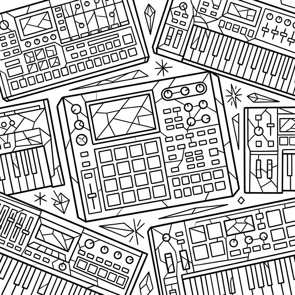 Bring these digital sound machines to life with your chosen palette! Consider using vibrant, translucent colors to mimic true stained glass, or experiment with metallic shades to highlight the electronic components. You can also play with contrasting colors to emphasize the different parts of each sampler, making the buttons, screens, and keys pop. Let your imagination flow as you transform this monochrome canvas into a masterpiece of musical art.