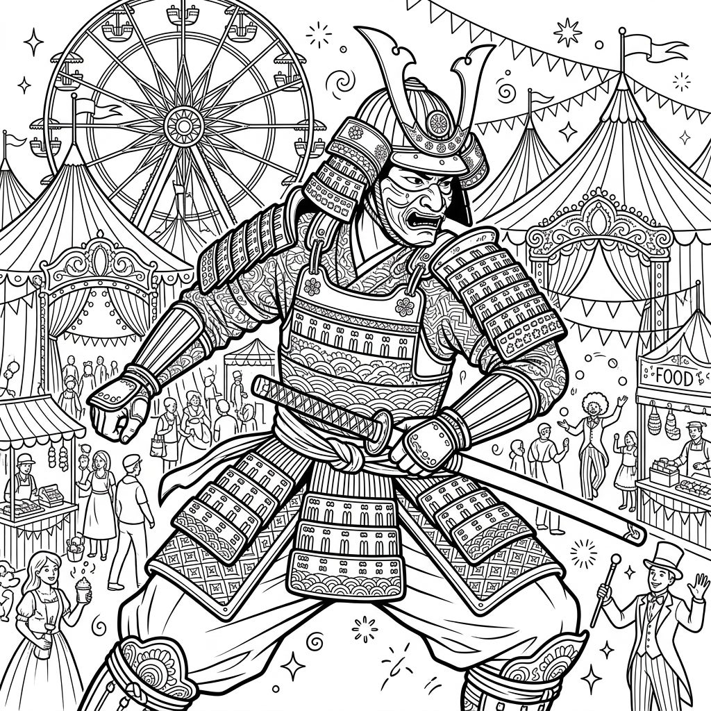 Immerse yourself in a captivating scene where ancient Japanese warrior culture clashes with the vibrant energy of a modern carnival. This meticulously designed adult coloring page showcases a formidable samurai, fully clad in traditional, intricately patterned armor, poised dynamically with his formidable katana. Every piece of his attire, from the layered plates to the elaborate helmet, is rendered with stunning detail, inviting you to bring rich textures and historical accuracy to life with your chosen palette.