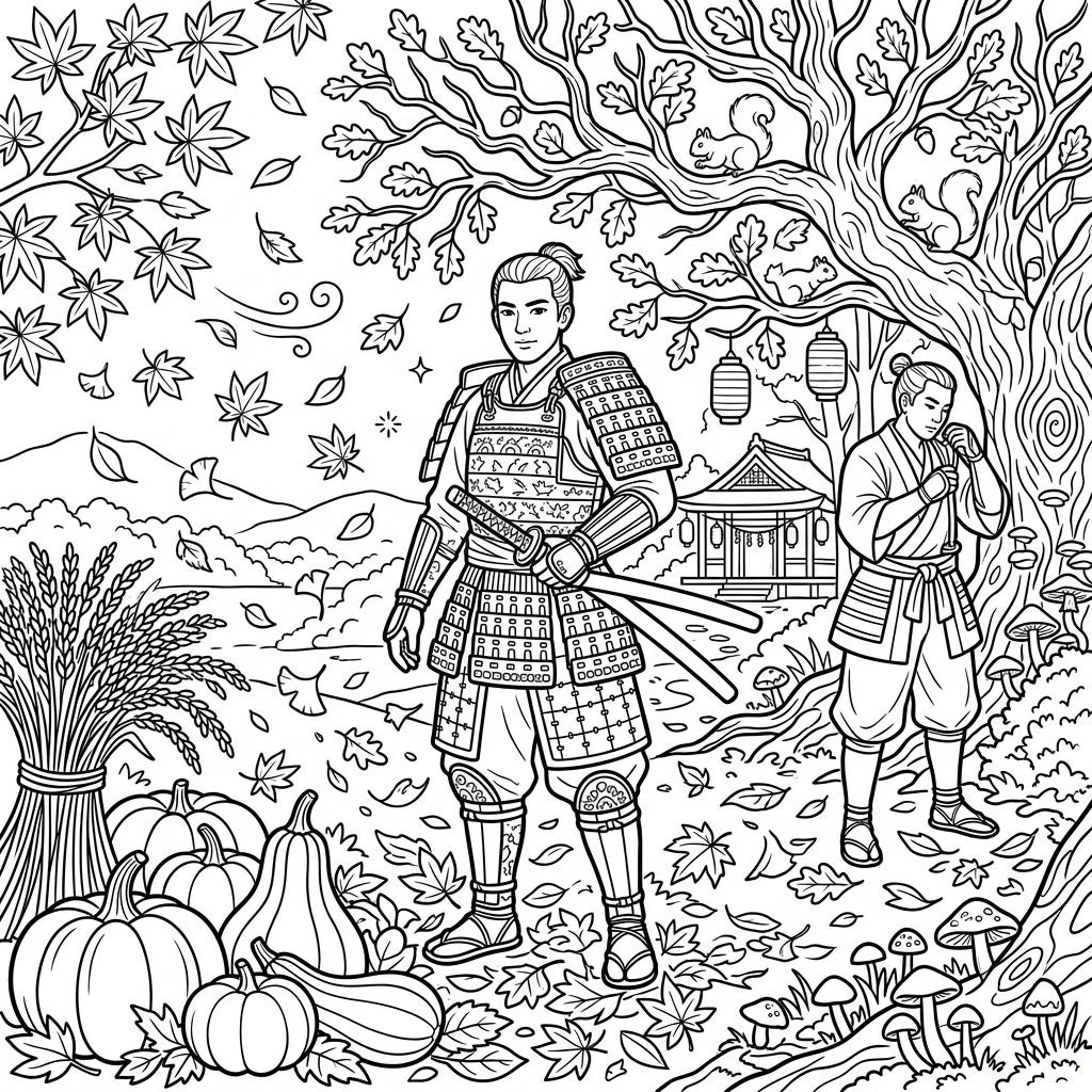 Step into a breathtaking autumn scene where the spirit of ancient Japan meets the beauty of fall. This captivating coloring page features noble samurai warriors amidst falling leaves and harvest delights, ready for your creative touch.