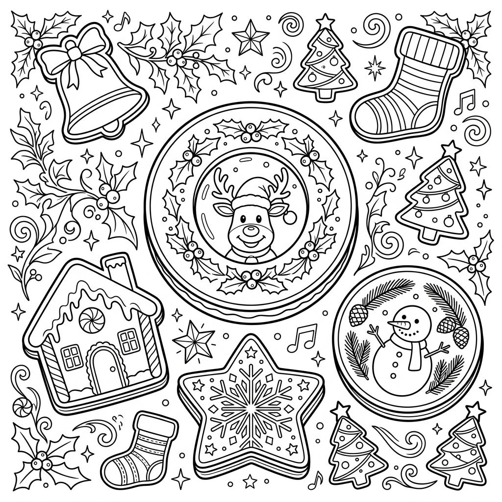 Unwrap the joy of the season with this intricately designed coloring page, brimming with an irresistible collection of Christmas sandwich cookies. Discover a charming reindeer cookie wearing a Santa hat, a jolly snowman, a cozy gingerbread house complete with icing details, and a beautifully frosted snowflake star. Each cookie is surrounded by classic holiday embellishments like sprigs of holly and berries, festive bells, striped stockings, decorated Christmas trees, twinkling stars, and whimsical musical notes, creating a rich tapestry of yuletide cheer.