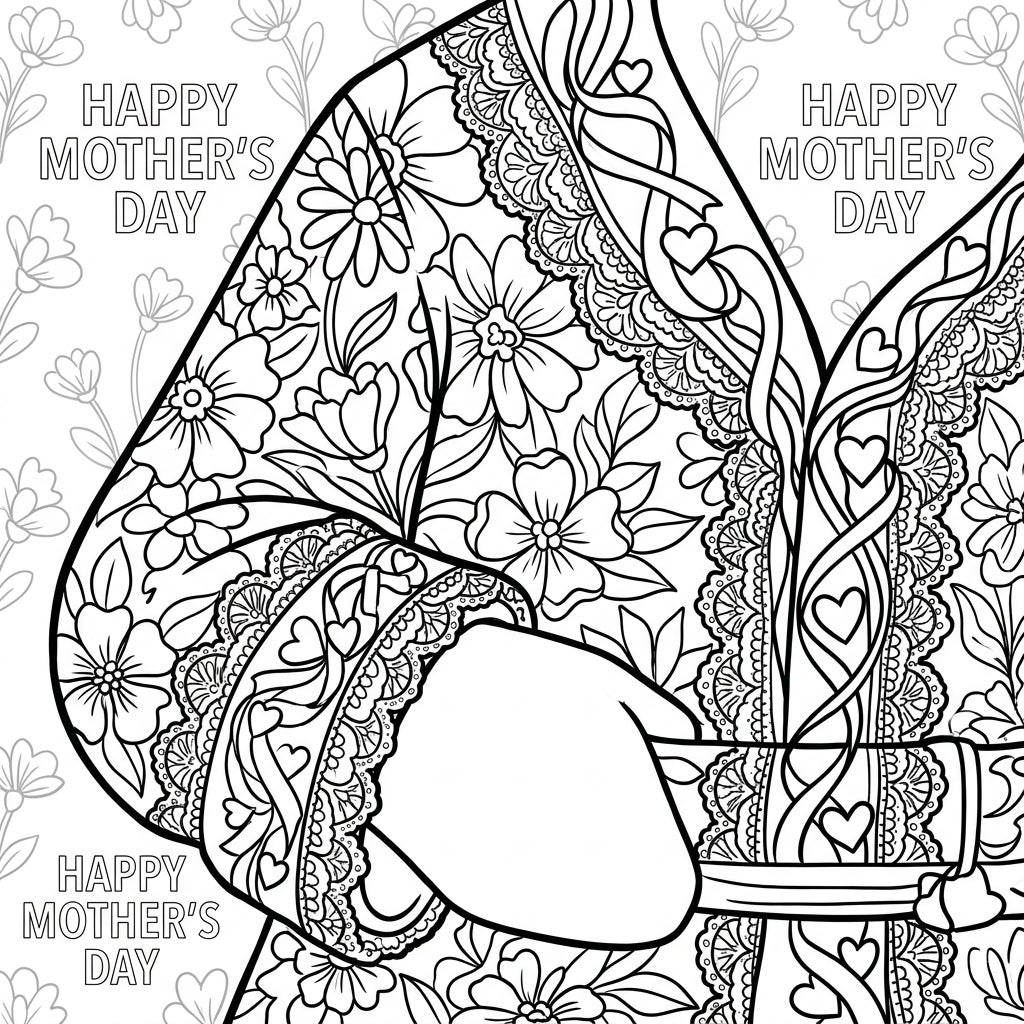 This enchanting coloring page reimagines Santa's iconic suit with a beautiful Mother's Day twist, transforming it into a canvas of intricate beauty. Adorned with an abundance of blooming spring flowers, delicate lace patterns, and gracefully intertwined ribbons, the design is a tribute to maternal love. Small, sweet hearts are subtly woven throughout the patterns, adding a touch of affection to every detail. The entire composition fills the frame, with a subtle backdrop of gentle floral motifs and 'Happy Mother's Day' messages, creating a rich and immersive coloring experience.