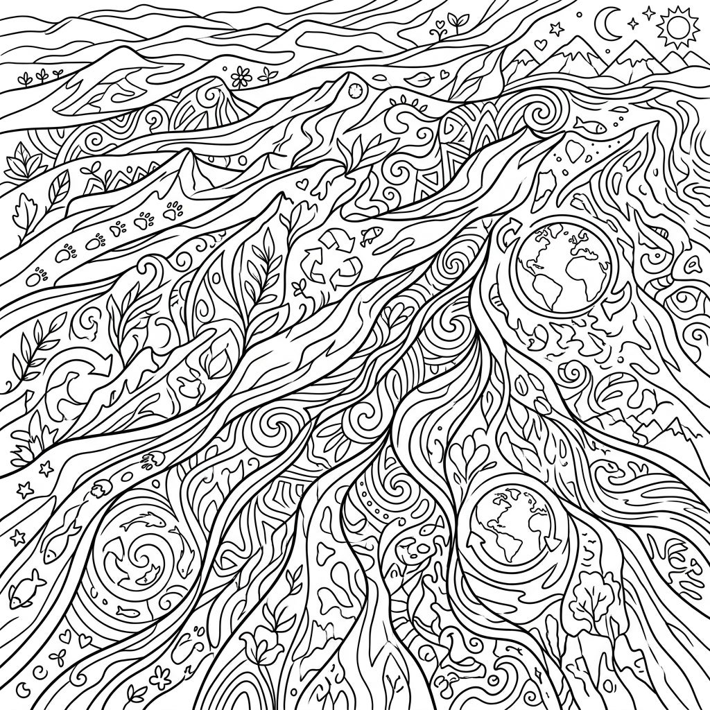 Dive into a breathtaking coloring journey with our unique Sastrugi & Earth Day design. This intricate illustration features flowing, wind-sculpted patterns reminiscent of Sastrugi ridges, gracefully intertwined with powerful environmental motifs. Discover hidden details like majestic mountains, delicate leaves, crucial recycling symbols, playful paw prints, swimming fish, and even globes of Earth, all meticulously designed to fill every inch of the page.