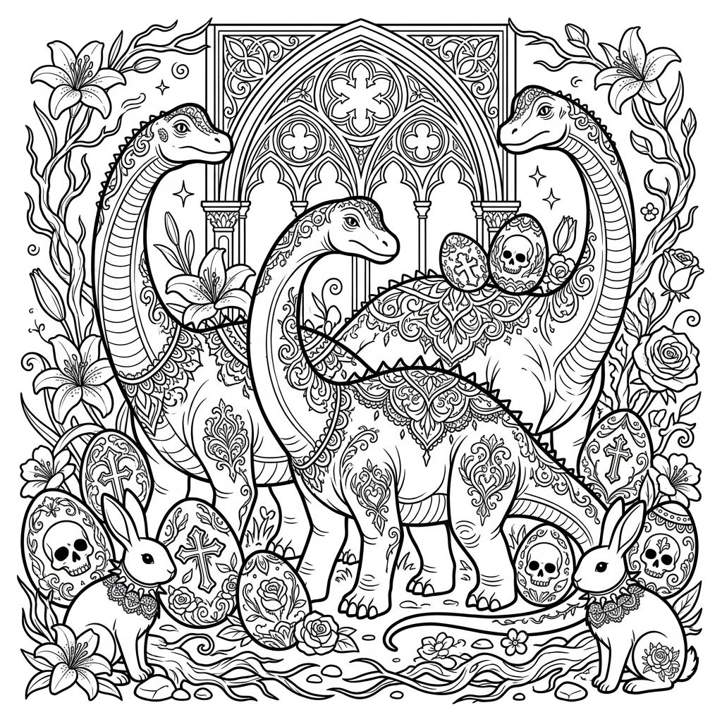 Step into a world where ancient giants meet Gothic elegance with this extraordinary coloring page. Three magnificent sauropod dinosaurs, adorned with intricate, lace-like patterns, stand regally amidst a detailed scene. Behind them, a grand Gothic archway frames the setting, while all around, decorated Easter eggs reveal surprising designs—some with ornate crosses and delicate roses, others with stylized skulls, adding a unique, edgy twist to the festive theme. Two charming bunnies, complete with Victorian-inspired lace collars, also join this peculiar celebration, surrounded by blooming lilies and roses.
