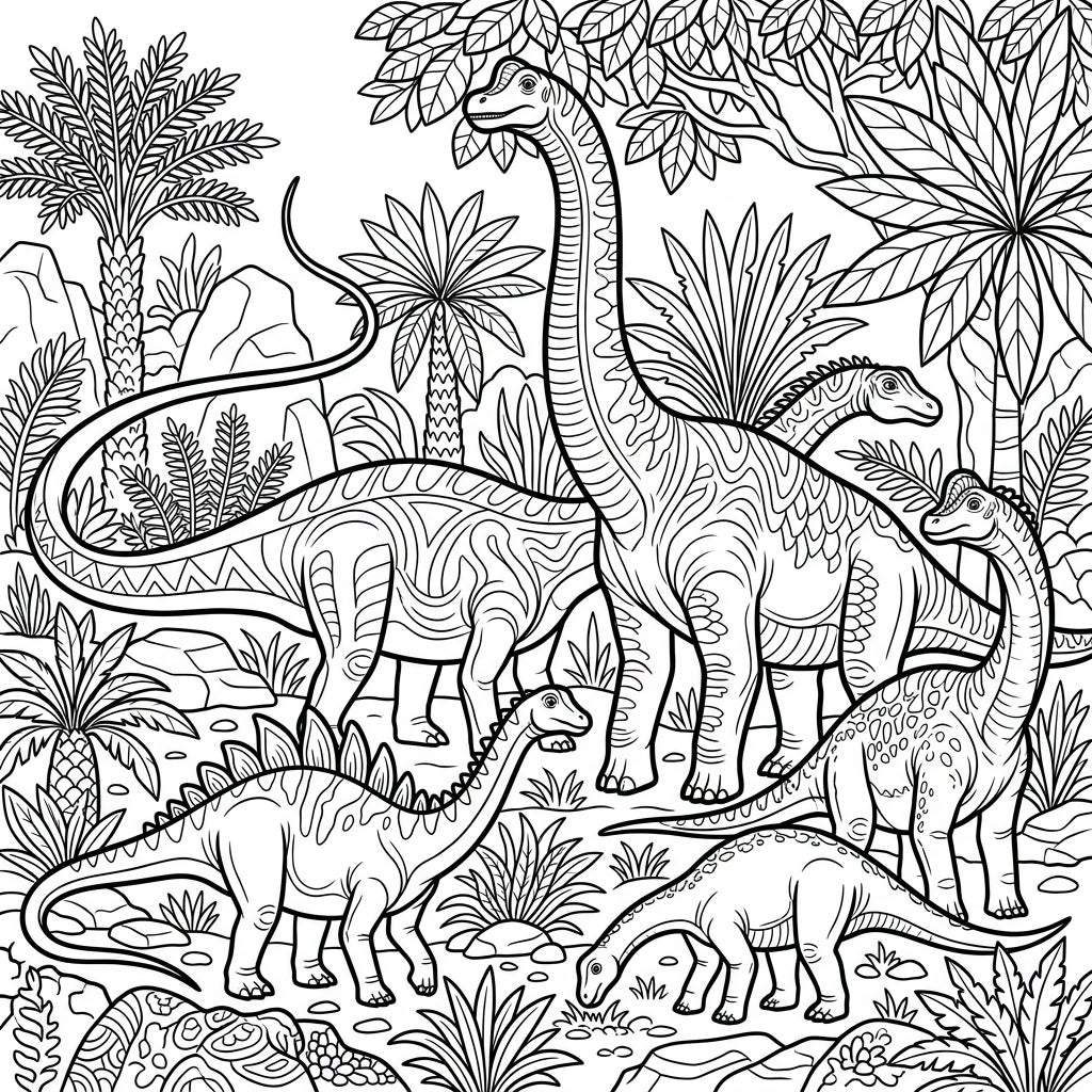 Embark on an epic journey back to the age of dinosaurs with this beautifully detailed sauropod coloring page. You'll discover a vibrant scene featuring multiple majestic long-necked sauropods, possibly including a brachiosaurus or diplodocus, along with another distinctive dinosaur, all set within a rich prehistoric environment. The intricate line art captures the essence of these ancient creatures, complete with unique patterns on their skin and scales, surrounded by lush flora like towering palm trees, dense ferns, and rugged rock formations.