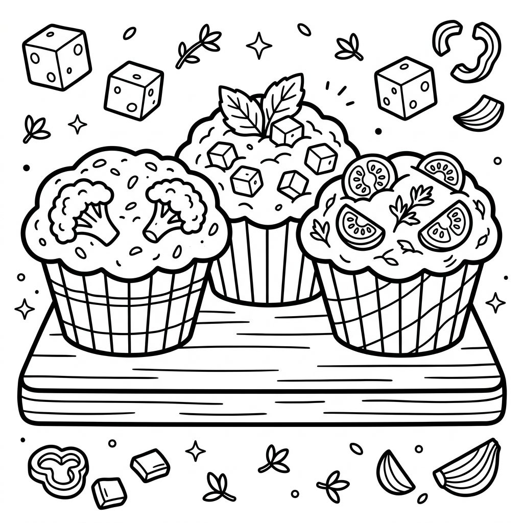 Dive into a world of tasty imagination with our Savory Muffins coloring page, perfectly crafted for little artists! This delightful template features three wonderfully round muffins resting on a rustic cutting board. Each muffin boasts its own unique, chunky topping: one crowned with florets of broccoli, another sprinkled with cheesy cubes, and the third adorned with juicy tomato slices and fresh herbs. Scattered around are simple, recognizable shapes of extra ingredients like bell peppers, garlic cloves, and more cheese, creating a full and engaging scene for your child to explore.