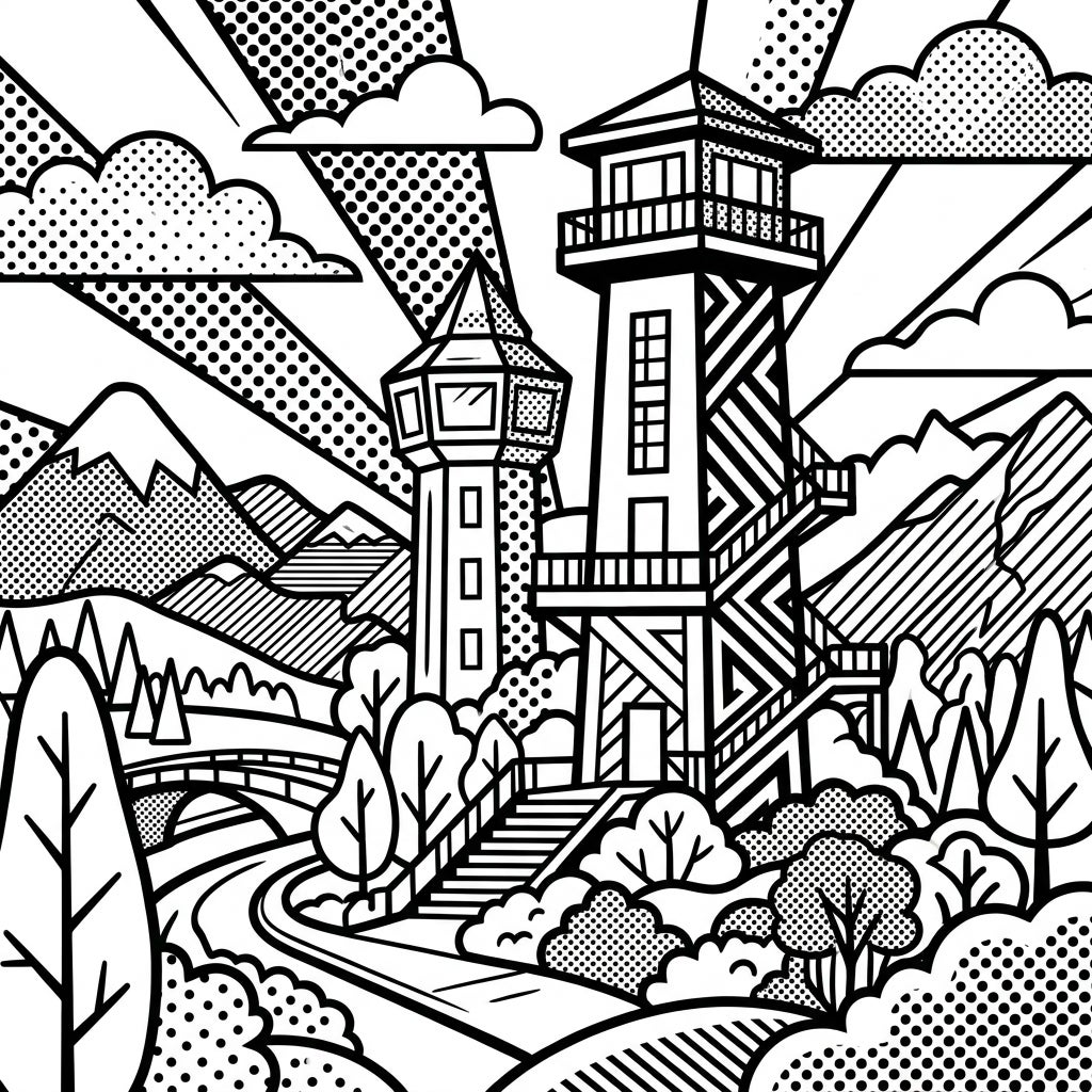Explore a dynamic landscape on this Pop Art coloring page, showcasing two impressive scenic park towers. One tower stands tall with multiple windows and a viewing balcony, while the other offers a unique octagonal top, both set against a backdrop of rugged mountains. The foreground is alive with a winding road, a charming bridge, and a variety of trees and bushes, all brought to life with the signature bold outlines, halftone dot patterns, and graphic line work of the Pop Art style.
