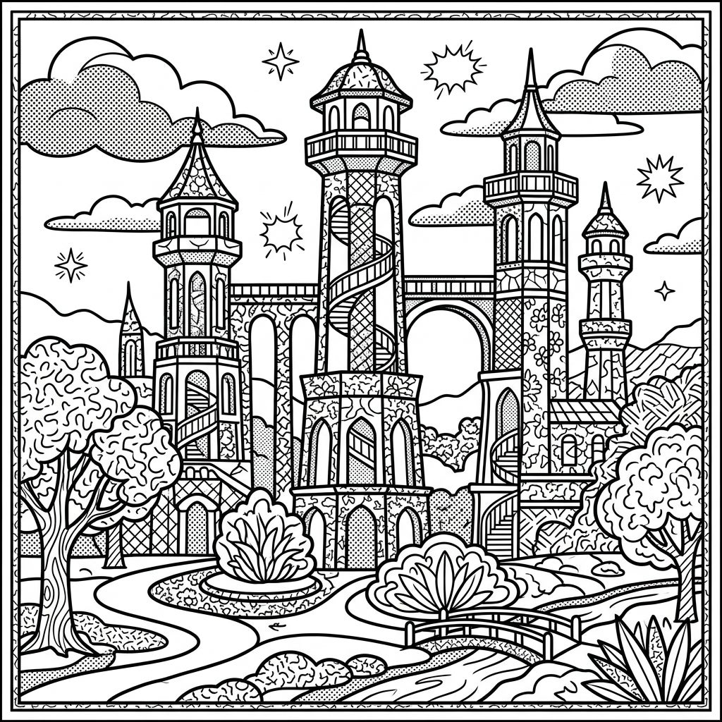 Step into a world where grandeur meets graphic artistry with our Pop Art Scenic Park Towers coloring page. This intricate design showcases a breathtaking panorama of multiple towering structures, each adorned with unique architectural details like spiral staircases, archways, and ornate patterns. The natural surroundings, including lush trees, winding paths, and serene bridges, create a harmonious balance with the majestic towers, inviting you to explore every corner of this fantastical landscape.
