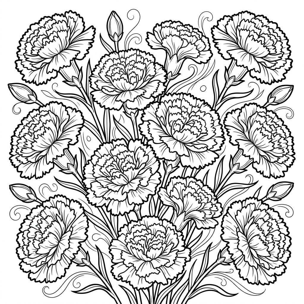 Dive into a garden of artistic possibility with our Scented Carnations coloring page. This detailed illustration presents a lush arrangement of carnation blooms, showcasing their signature ruffled petals and elegant forms. Each flower is rendered with clean, thick outlines, inviting you to explore the myriad textures within and bring them to life with your chosen palette. The composition is rich and full, with unopened buds and delicate foliage nestled amongst the vibrant blossoms, ensuring a captivating coloring experience from edge to edge.